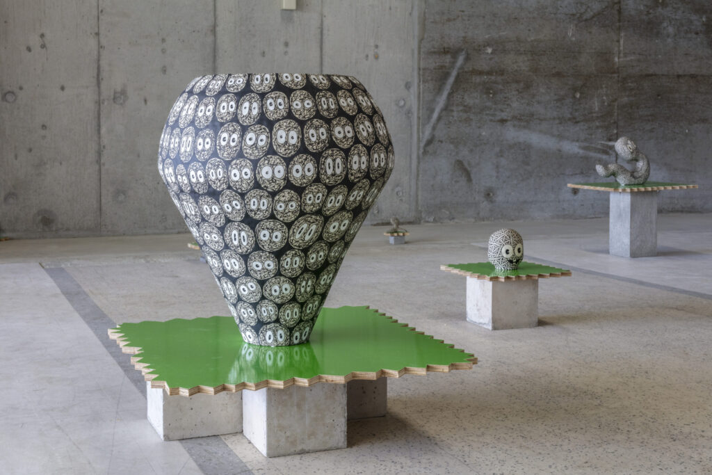 彫刻作品は、(多くの場合)生物的なフォルムを模倣したり、そこから派生したりしており、しばしば拡大・変形され、よりミニマルな表現へと発展します。形そのものは親しみやすく脅威を感じさせませんが、細部――縫い目や縁、開口部、表面など――が、まだ明かされていない情報の存在を示唆し、鑑賞者に「その起源」「意図」「目的」を問いかけます。